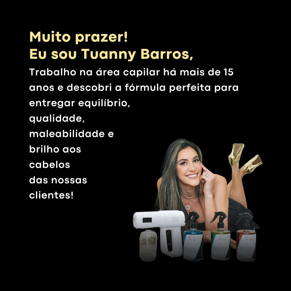 A especialista TUANNY BARROS HAIR traz pra você o que há de mais inovador no mercado de realinhamento e tratamento capilar. O PCS - PROTOCOLO CABELO DOS SONHOS apresenta o melhor BLEND DE ÁCIDOS profissional que promove um alinhamento perfeito e duradouro, além do tão sonhado brilho espelhado. Contamos também com nossa linha ESSENTIAL HOME CARE produtos com tecnologia de ponta que vão complementar o seus cuidados em casa, te ajudando a manter seus fios fortes, tratados, brilhosos e livres do temido frizz.